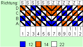 it Hilfe eines einfachen Musters soll die Wirkung der Drehrichtung auf das Muster erläutert werden. as Folgende Muster wird je zur Hälfte in S- und Z-Richtung aufgespannt. reht man die Karten nun immer in die gleiche Richtung, sieht das Muster wie folgt aus.